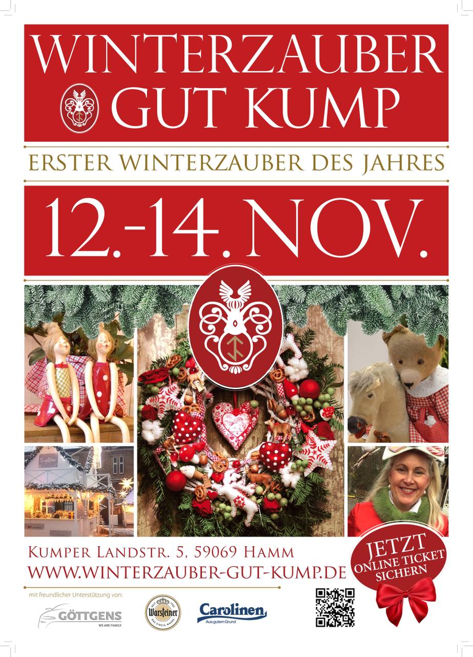 In einmaliger Kulisse läutet der Winterzauber Gut Kump die herrliche Vorweihnachtszeit ein. In traumhafter Atmosphäre und mit romantischer Illumination wird die schönste Zeit des Jahres zelebriert. Das stimmungsvoll inszenierte Gutsgelände wird Sie garantiert in Weihnachtsstimmung versetzen. Rund 120 exklusive Aussteller aus dem In- und Ausland präsentieren sich in historischer Kulisse und haben mit viel Sorgfalt die schönsten Artikel und Anregungen für Sie zusammengetragen. Entdecken Sie handgefertigte Einzelstücke, Mode, Accessoires, Möbelkreationen, Lebensart, Genuss, Wohn- u. Lifestyle sowie Besonderheiten für Haus & Garten. Alles was das Herz höher schlagen lässt, finden Sie beim Winterzauber Gut Kump.