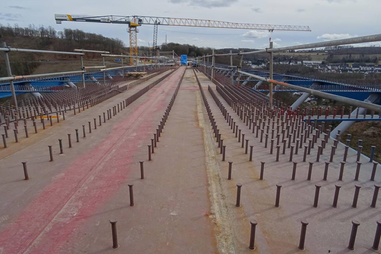 Wissing war ins Sauerland gekommen, um sich ein Bild vom Baustellenfortschritt zu machen: Seit mehreren Monaten wird der stählerne Überbau von beiden Seiten des Tales Stück für Stück über die Pfeiler geschoben. Nun sind beide Teile nur noch wenige Meter voneinander entfernt und sollen zeitnah miteinander verbunden werden, wie es am Dienstag von der Autobahn GmbH hieß. Der Brückenbauer spricht in so einem Fall von der "Stahlhochzeit".