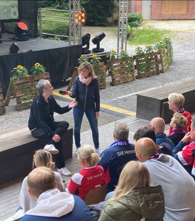 Sportjournalist und Fußball-Comedian Arnd Zeigler hat Station in Hamm auf der Waldbühne Hamm-Heessen gemacht. Dabei hat er auch Mitglieder vom SVE Heessen zum Meet & Greet getroffen.