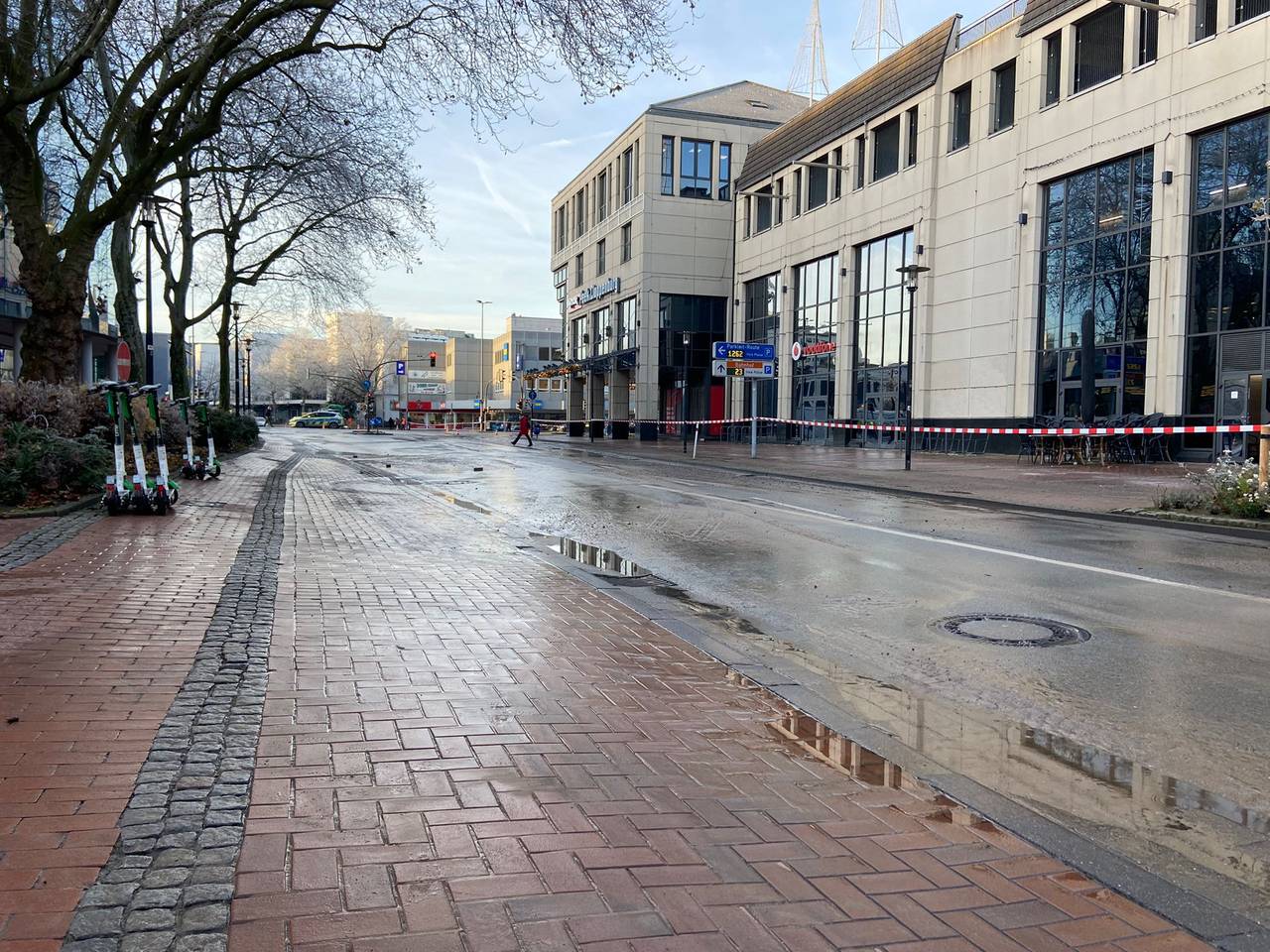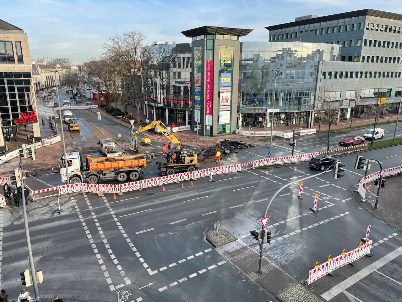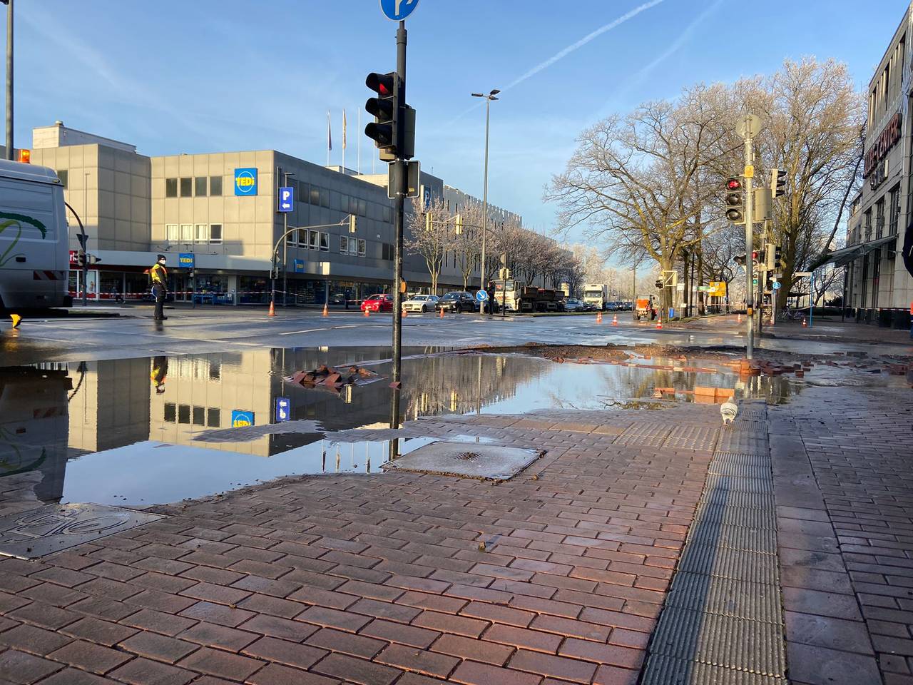 Nach dem Wasserrohrbruch in der Innenstadt wird die Baustelle an der Kreuzung Westenwall/Westring noch bleiben, weil es über die Feiertage kein passendes Material gibt.