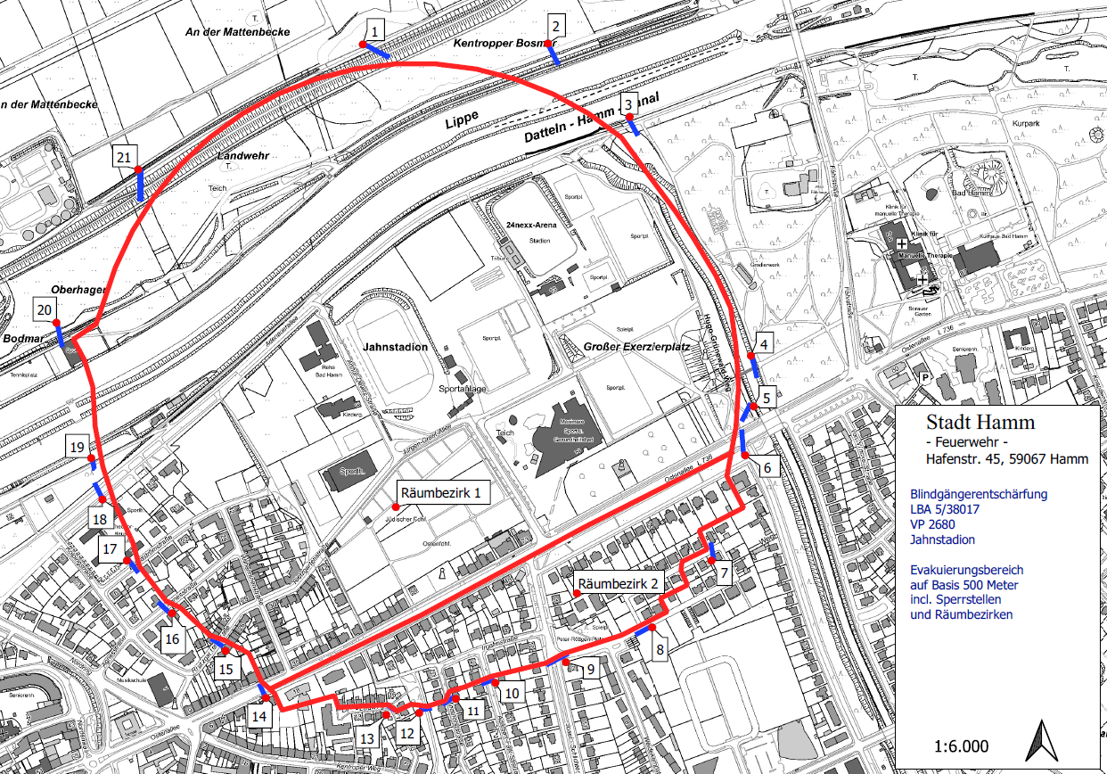 Im Bereich Bad Hamm ist eine Bombe gefunden worden. Sie soll noch heute, Dienstag, 26.09. entschärft werden. Hierfür wurde ein Radius von 500 Metern um den Fundort festgelegt, der zu evakuieren ist. Betroffen sind rund 200 Adressen mit etwa 1.000 Anwohner:innen - vor allem aber müssen auch das Maximare, die Reha Bad Hamm und die Sport-Kita Wirbelwind ihre Gebäude verlassen. Für die betroffene Bevölkerung wird eine Betreuungsstelle eingerichtet und zeitnah bekannt gegeben, so die Stadt.
