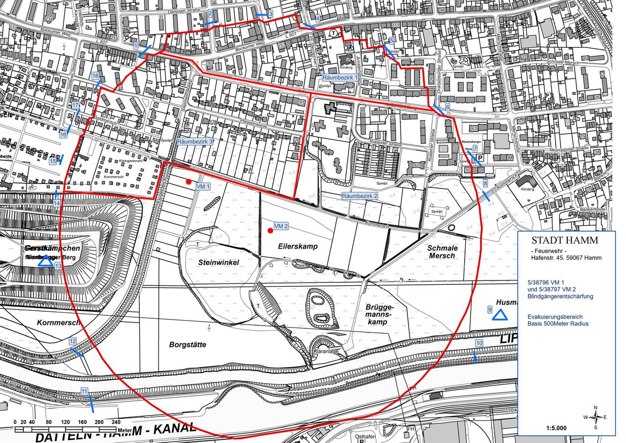 Der Kampfmittelräumdienst hat gestern im Rahmen von Sondierungsmaßnahmen eine 250kg und eine 500kg Sprengbombe aus dem 2. Weltkrieg entdeckt. Die Blindgänger lagen in einem Abstand von nur ca. 200 Metern im Bereich von landwirtschaftlichen Flächen südlich des Weges Kornmersch im Hammer Norden. Seit 17 Uhr lief die Evakuierung. Am Galilei Gymnasium wurde eine Betreuungsstelle eingerichtet. Gegen 21:45 Uhr teilte die Einsatzleitung der Feuwehr mit, dass die zwei Fliegerbomben entschärft wurden. Beide Bomben wurden zeitgleich entschärft.