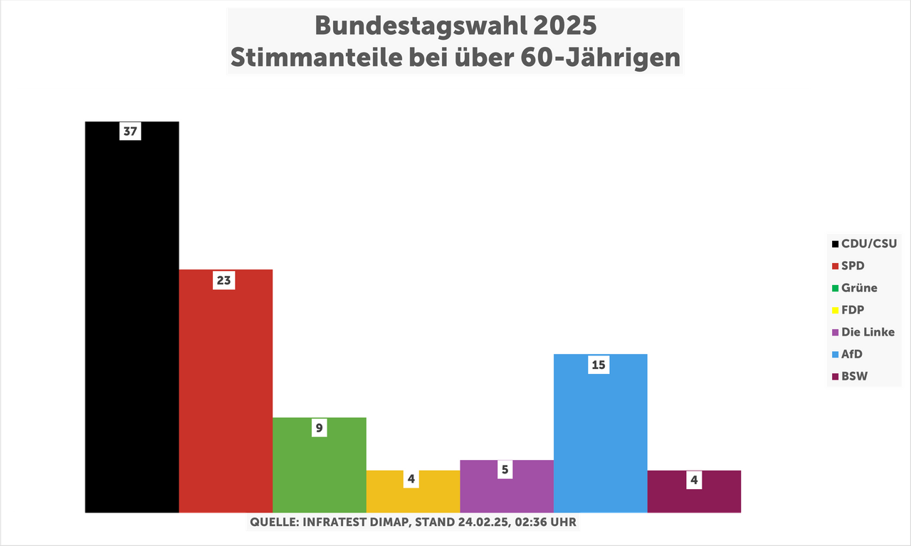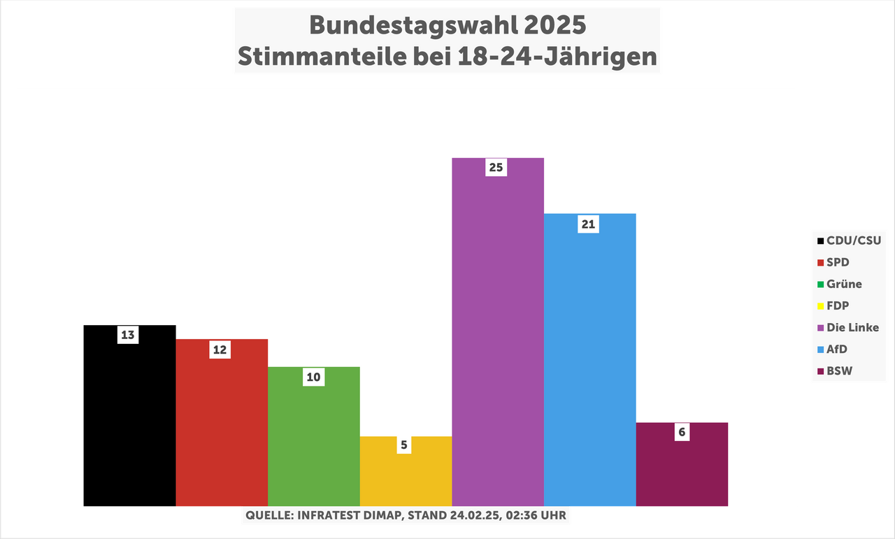 26 Prozent für Die Linke, 21 Prozent für die AfD. Das ist das Wahlergebnis für junge Wählerinnen und Wähler im Alter von 18 bis 24 Jahren bei der Bundestagswahl 2025. Laut Forschungsgruppe Wahlen wurden in diesem Alterssegment also vor allem die Ränder gewählt. CDU/CSU, SPD, Grüne oder FDP lagen zwischen 6 und 13 Prozent. Bei den über 60-Jährigen dominieren vor allem die gesetzten Parteien. CDU/CSU erreichen 38 Prozent, die SPD kommt auf 23 Prozent.