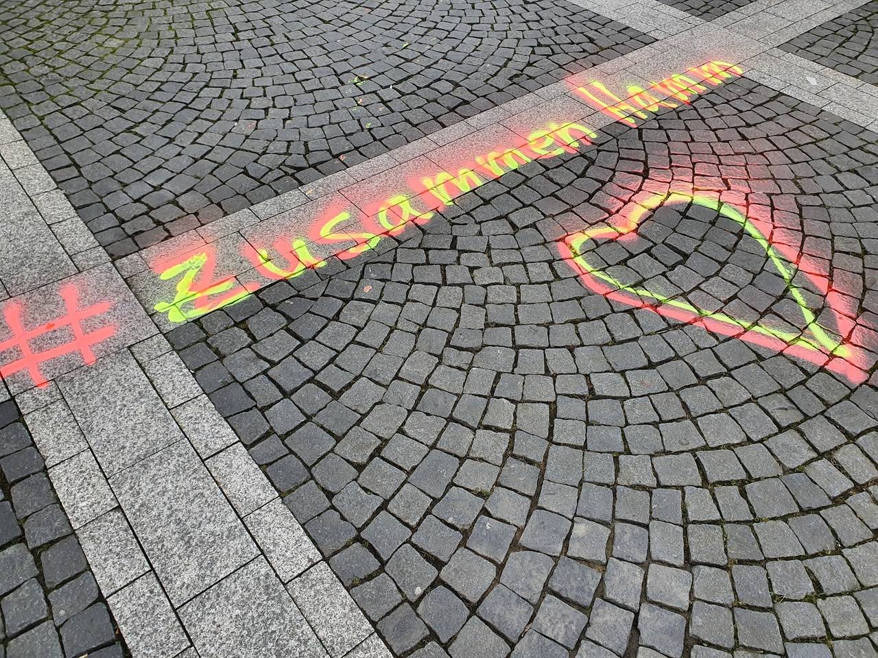 Jugendliche der evangelischen Jugendkirche haben den Martin-Luther-Platz bemalt. Mit einem Spray und Kreide haben sie auf die Aktion #zusammenhamm aufmerksam gemacht. Sie soll den Zusammenhalt unserer Stadt stärken. Die Jugendlichen haben dafür "Bleibt gesund" und "Wir sind eine Gemeinschaft" in bunten Farben auf den Martin-Luther-Platz gesprüht.