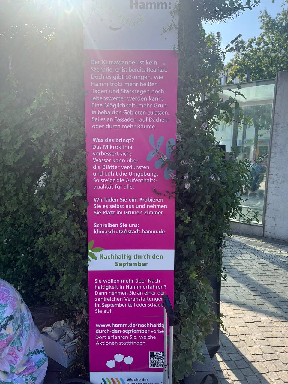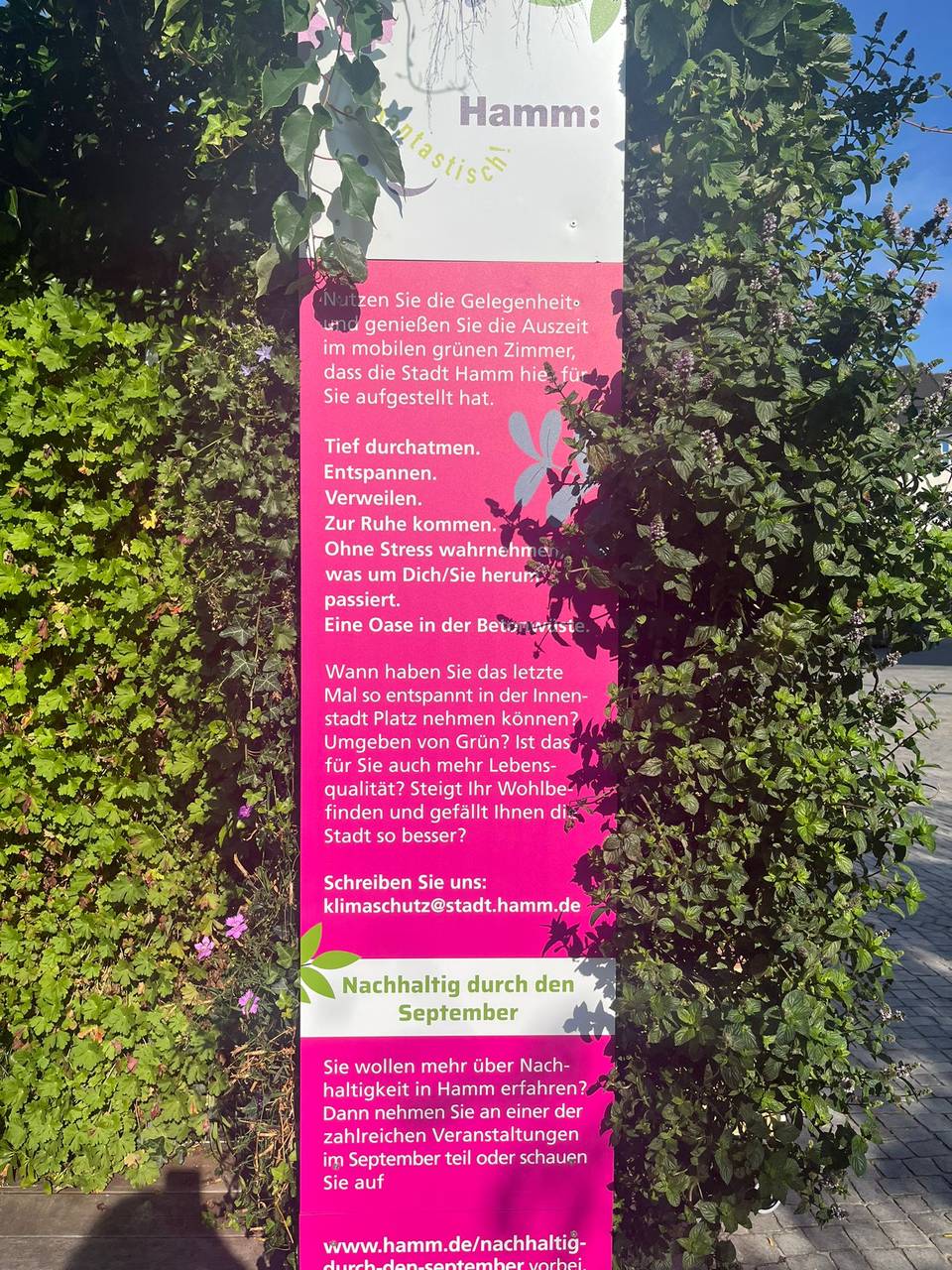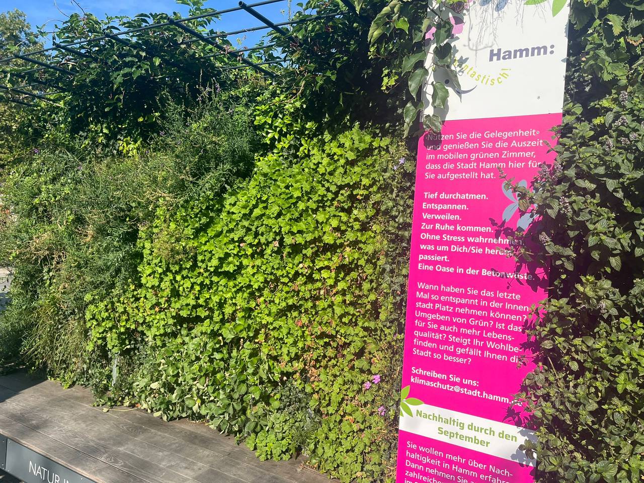 Das "Mobile Grüne Zimmer" ist am Bahnhofvorplatz gegenüber der Bibliothek zu finden. Es ist ein offener Container mit Pflanzwänden und einer Sitzfläche und dient als ein schattiger und gemütlicher Rückzugsort "im Grünen" mitten in der Stadt. Das Grüne Zimmer soll den Hammern auch zeigen, was für einen Unterschied es machen kann, zwischen Pflanzen zu sitzen, sagt uns Klimafolgeanpassungsmanagerin Wilma Großmaas im Lippewelle-Gespräch. Pflanzen um sich herum zu haben wirke nämlich entspannender auf den Menschen, als von Beton umgeben zu sein, betont Großmaas. Deshalb soll das Grüne Zimmer vor allem auch als Inspiration für zukünftige ökologische Gestaltungsmöglichkeiten dienen. Das Mobile Grüne Zimmer ist Teil des Projekts "Nachhaltig durch den September" und bleibt bis Ende September am Bahnhofvorplatz.