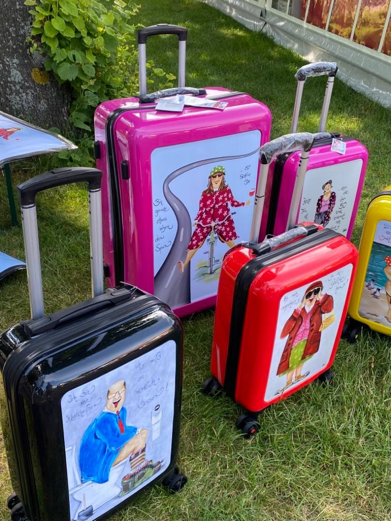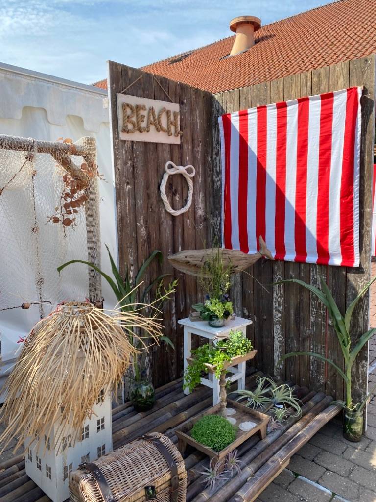 Gartendekoration liegt auf der Wiese. Im Hintergrund stehe Menschen an den Verkaufsständen bei der Landpartie Gut Kump.