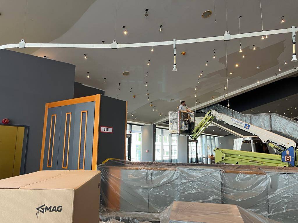 Derzeit muss vieles gleichzeitig oder in Abstimmung laufen. Der Hammer Kinoleiter Carsten Dunke lobt aber die gute Abstimmung unter den Firmen. Er ist zuversichtlich bis Mitte Mai fertig werden zu können, wenn auch wahrscheinlich erst direkt mit dem Eintreffen der ersten Besucher. Aber das sei bei Großprojekten dieser Art normal.