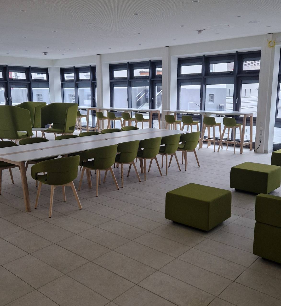 Die Neubauten sind braun verklinkert mit großen Fensterfronten und passen sich architektonisch gut an das alte Falkschul-Gebäude an. Im Inneren gibt es neben den Klassenräumen und der großen Küche moderne Lerninseln mit grünen Lounge-Möbeln und Parkettboden. Die Oberstufenschüler können hier ihre Laptops einstöpseln und selbstständig vor der großen Fensterfront lernen. Daneben gibt es natürlich auch Kunst-, Musik- und Werkräume sowie Labore für den naturwissenschaftlichen Unterricht.