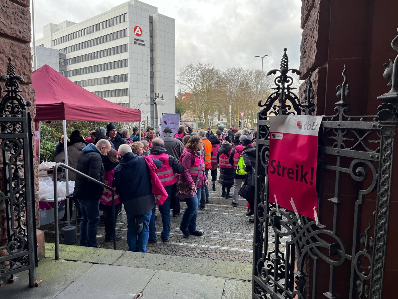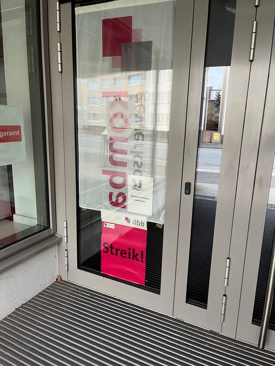 Gestern waren die Stadtverwaltung und die Stadtwerke zum Streik aufgerufen. Rund 80 Teilnehmer hatten sich vor dem Rathaus versammelt. Bestreikt wurden u.a. Bürgerämter und auch die Müllabfuhr. Die Gewerkschaften fordern in den Tarifverhandlungen gut 10 Prozent mehr Geld - die Arbeitgeber haben noch kein Angebot vorgelegt. Heute sollen die Auswirkungen des Warnstreiks beim Jobcenter für die Kunden aber kaum spürbar sein, sagte uns Sprecherin Heike Nowak. Donnerstags seien ohnehin keine allgemeinen Sprech- oder Öffnugnszeiten. Die Kunden, die heute kämen, haben einen Termin. Dringende Anliegen ohne Termin würden aber heute auch bearbeitet, so Heike Nowak.