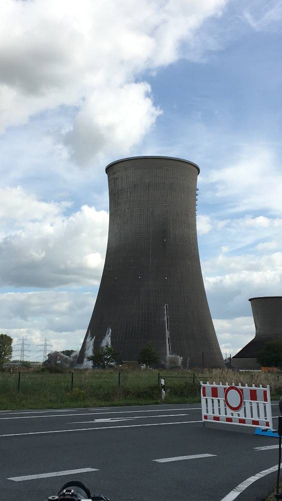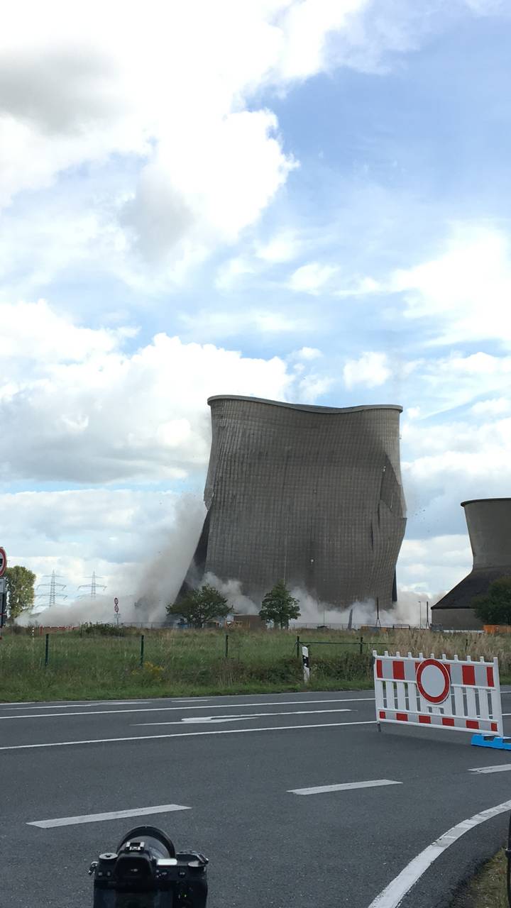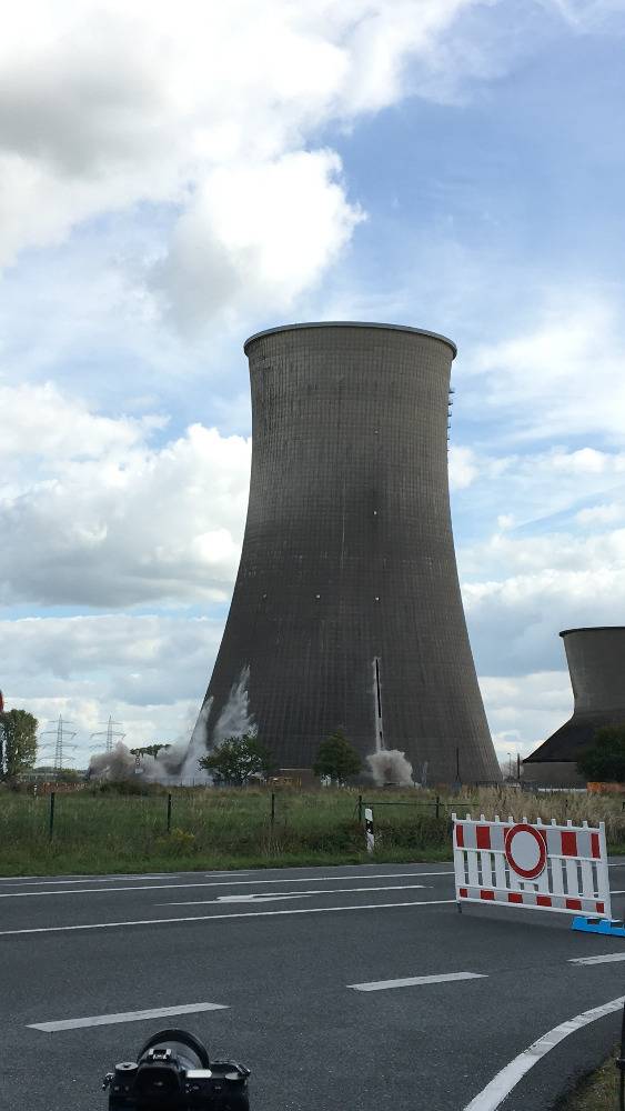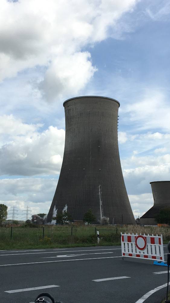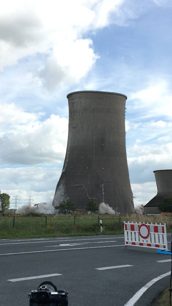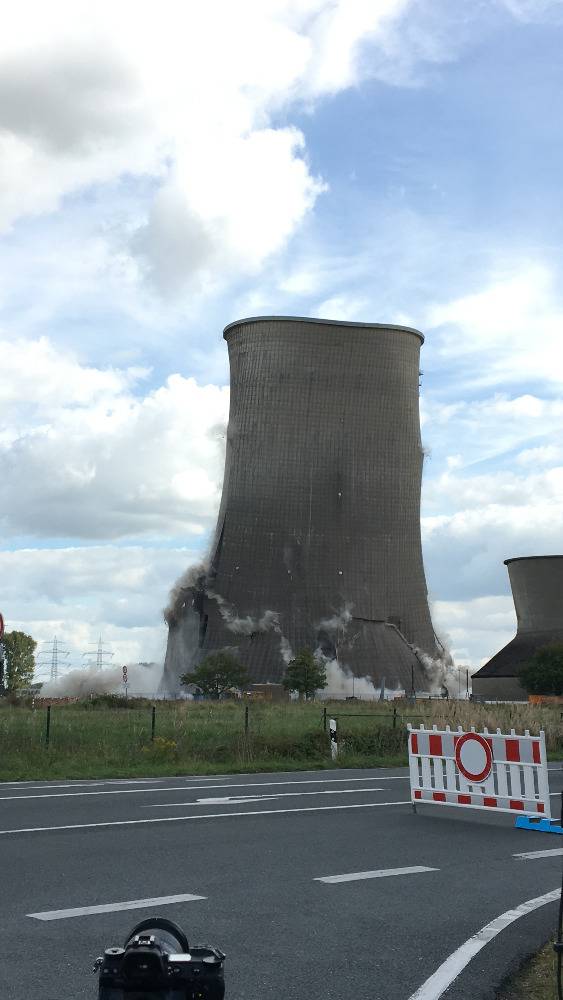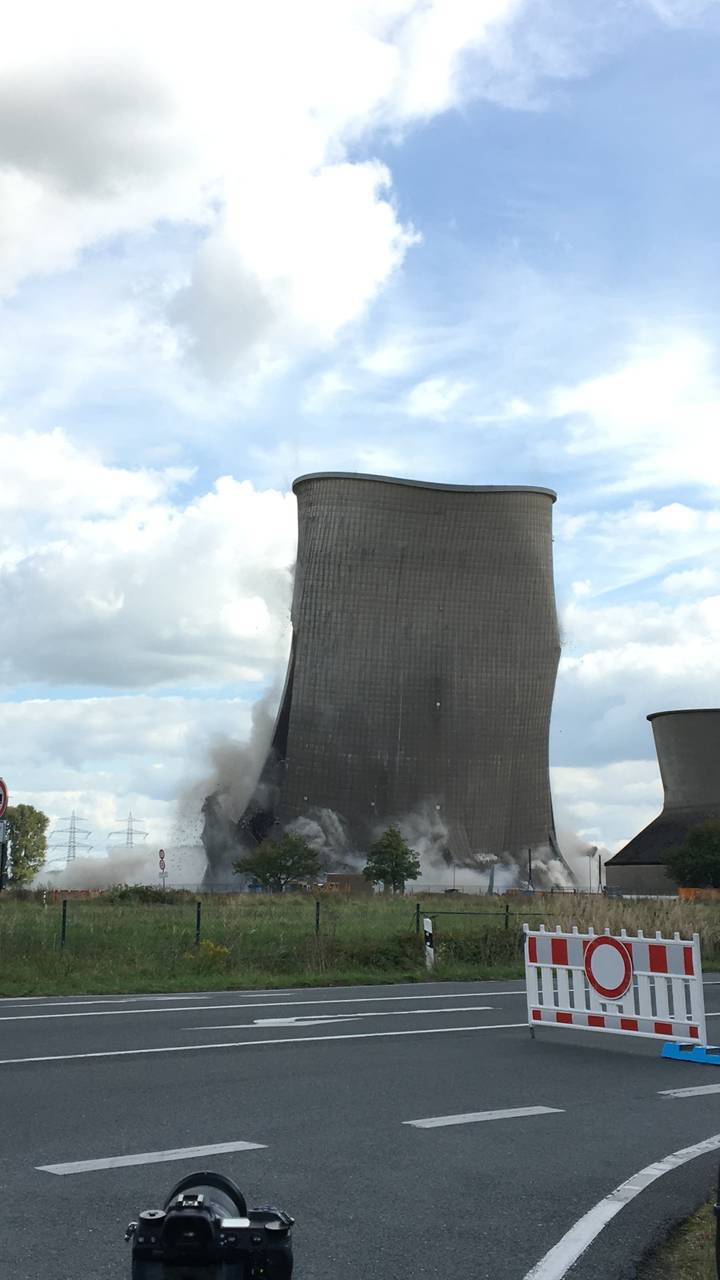 Uentrop hat ein Wahrzeichen weniger. Um kurz nach 14 Uhr ist der Kühlturm von Block C am Kraftwerk Westfalen gesprengt worden, mit Hilfe von 90 Kilo Sprengstoff sackte der 122 Meter hohe Turm wie geplant in sich zusammen.