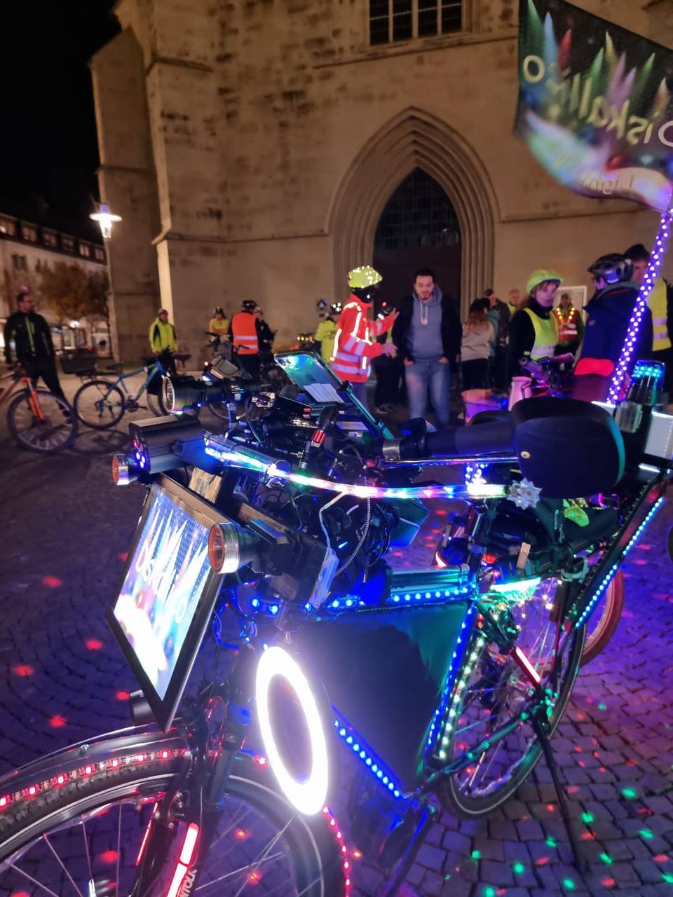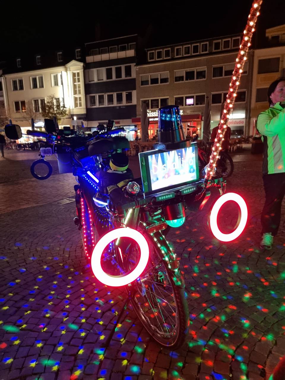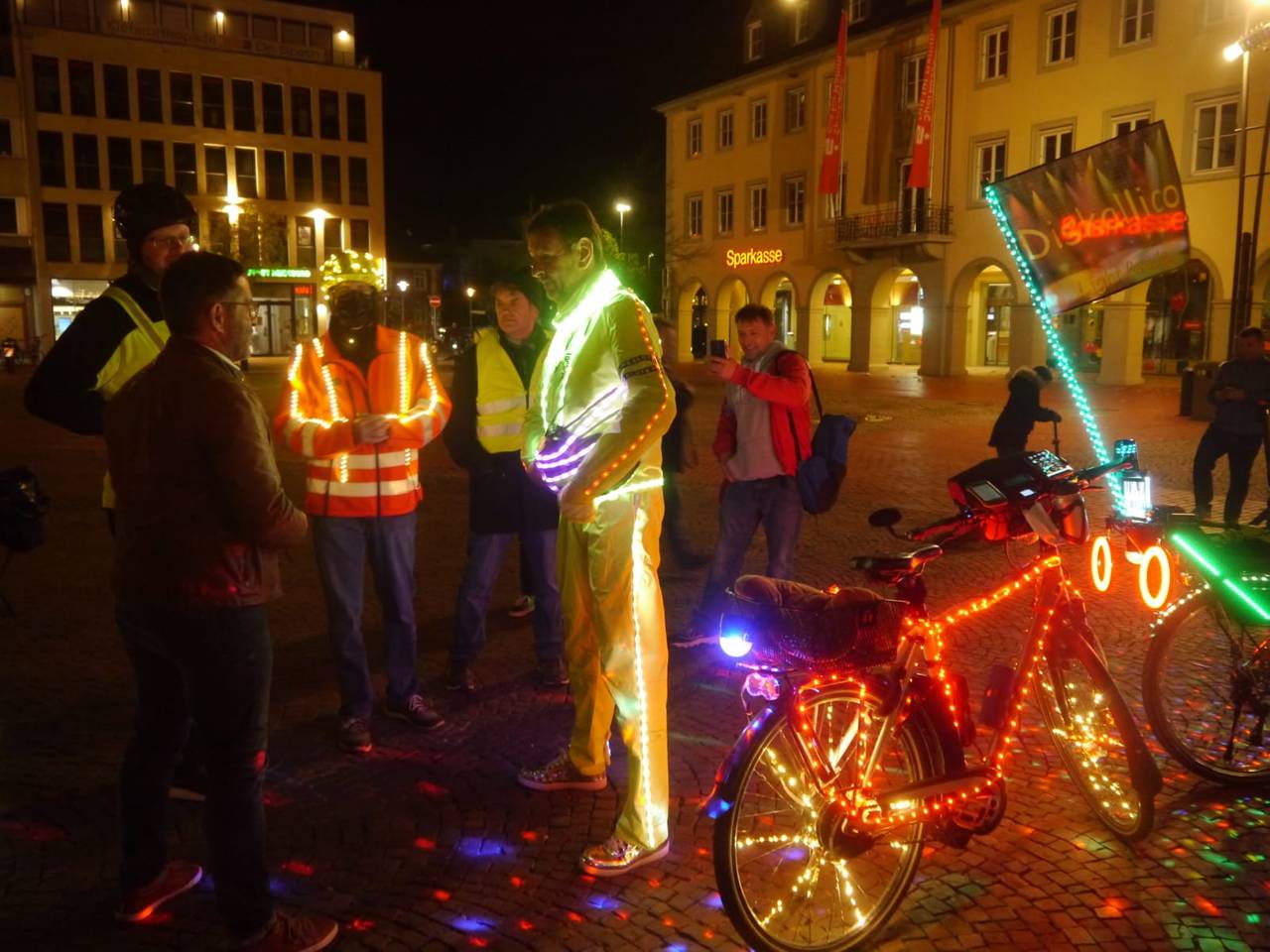 Wenn euch mal abends im Dunkeln ein sehr sehr heller Fahrradfahrer entgegenkommt, das ist Karl Jehle aus Herbern. Er nennt sich Diskallico und hat überall Licht am Fahrrad. Am Samstag ist der Lichtradler aus Herbern zu einer Fahrradtour durch Hamm gestartet. Am Marktplatz an der Pauluskirche gings los, auch Oberbürgermeister Marc Herter war mit dabei.