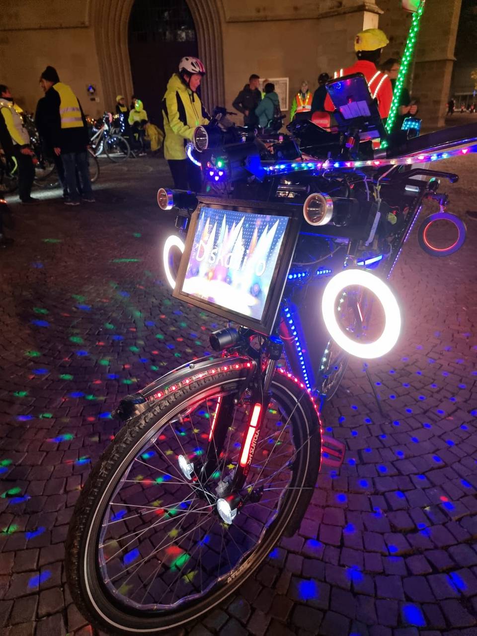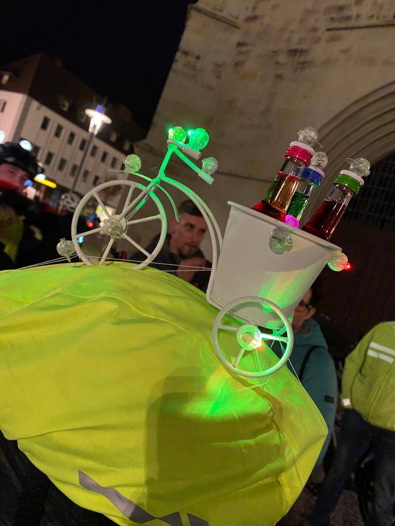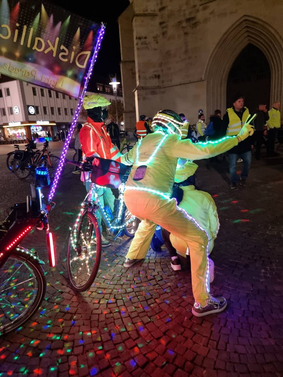 Wenn euch mal abends im Dunkeln ein sehr sehr heller Fahrradfahrer entgegenkommt, das ist Karl Jehle aus Herbern. Er nennt sich Diskallico und hat überall Licht am Fahrrad. Am Samstag ist der Lichtradler aus Herbern zu einer Fahrradtour durch Hamm gestartet. Am Marktplatz an der Pauluskirche gings los, auch Oberbürgermeister Marc Herter war mit dabei.