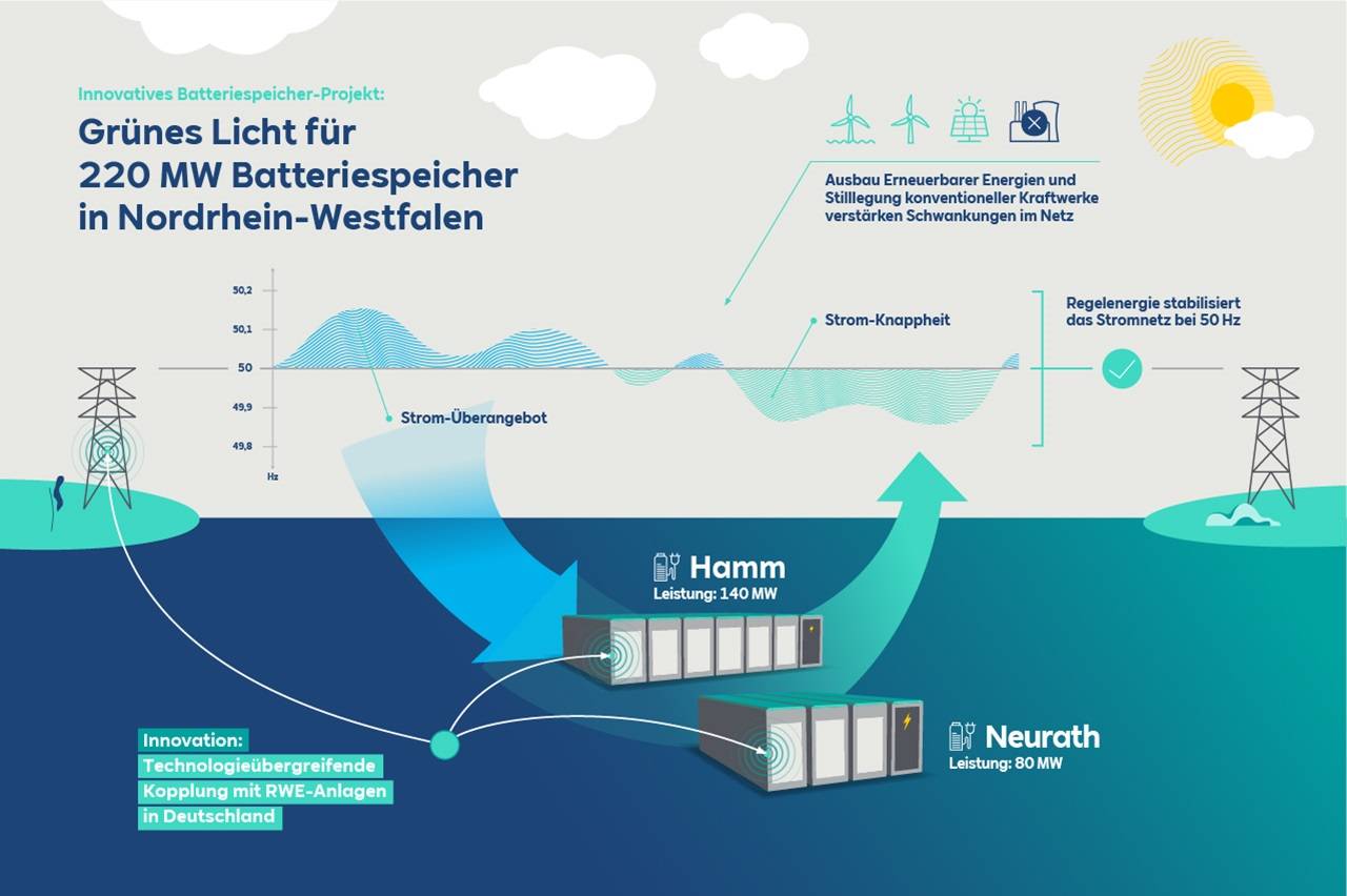 In Hamm werden am Kraftwerk Westfalen Batterien mit einer Gesamtleistung von 140 Megawatt auf 14.000 m² errichtet. Die Anlage gleicht Schwankungen im Stromnetz sekundenschnell aus und sorgt so für eine zuverlässige Stromversorgung. "Hinsichtlich Größe und Technologie setzen wir mit dem entstehenden Batterie-Großspeicher in Neurath und Hamm europaweit Maßstäbe", betont Roger Miesen, Vorstandsvorsitzender der RWE Generation.