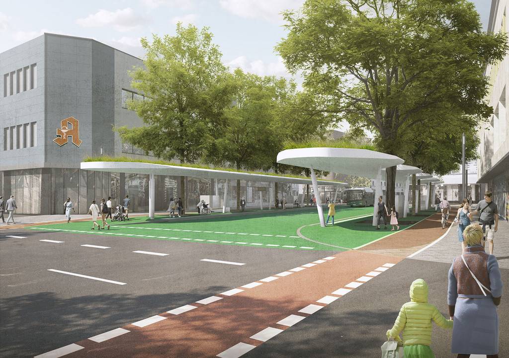 Die alten Überdachungen werden durch neue ersetzt, die schwebenden Flügeln ähneln sollen. Außerdem bekommen sie eine Dachbegrünung. Es wird keinen Mittelsteig mehr geben wie vorher, sondern eine Durchfahrtzone, damit der Busverkehr besser abgewickelt werden kann und um die Fahrradfahrer besser durch die Haltestelle zu bekommen, so Marc Herter.