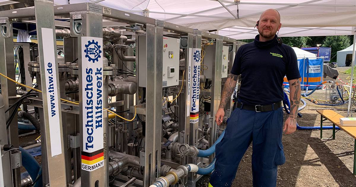 Benjamin Günther vom THW bereitet Trinkwasser für die Menschen in Bad Neuenahr auf.