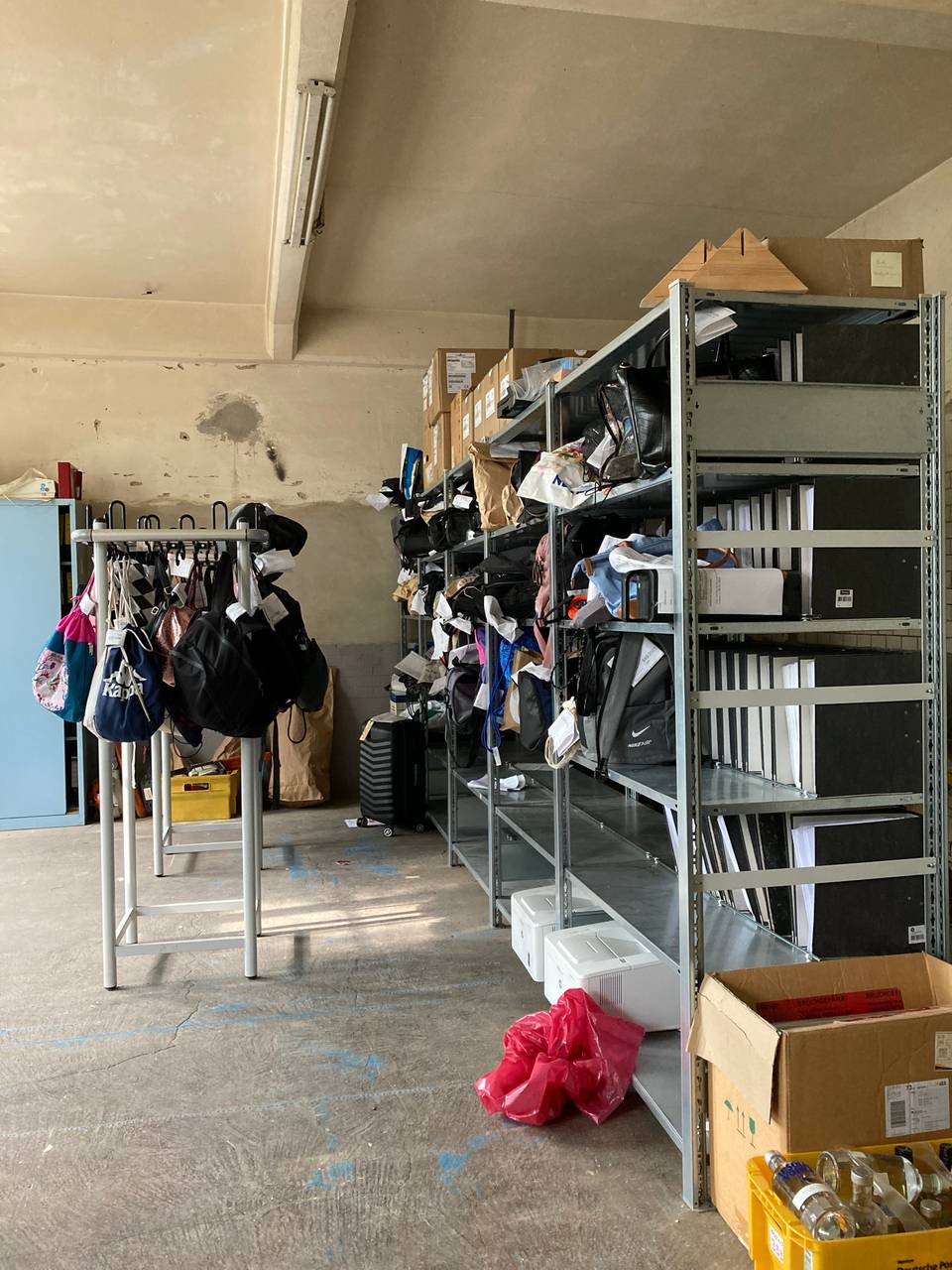 Im Lager im Keller der Maxihalle steht ein großes Regal, auf dem vor allem Schultaschen stehen. Diese Fundsachen werden zum größten Teil von den Stadtwerken abgegeben - zum Beispiel, wenn sie jemand im Bus liegen lassen hat.